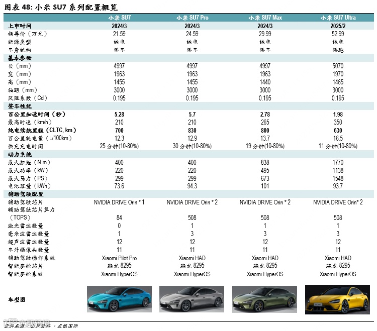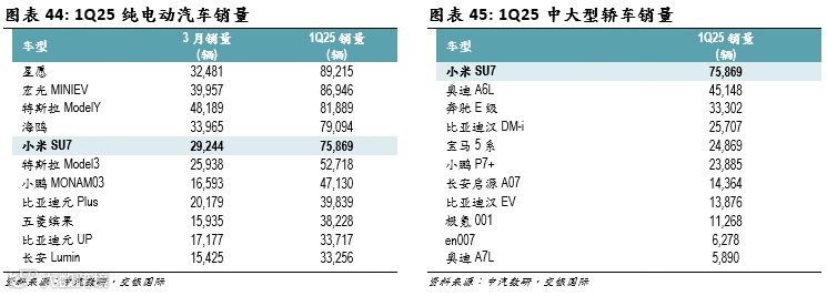 小米于2021年3月宣布造车,计划在10年内投资100亿美元,首期投入人民币100亿元;2022年开始自建工厂,分两期建设,规划年产能总计30万辆,一期工厂在2023年6月已竣工;2023年完成冬测和夏测;2023年12月,SU7亮相发布会,并于2024年3月正式上市,4月开启交付,起售价21.99万元,定位中大型纯电轿跑,瞄准特斯拉Model 3同价位市场。SU7上市24小时内订单突破8.8万辆,其2024年交付目标也从最初的7万辆一路上调至12万辆,并在2024年最终交付13.7万辆。根据中汽数研数据,1Q25,小米SU7以7.6万辆的销量位列纯电动汽车销量第五以及中大型轿车销量第一;通过打造小米SU7爆品,1Q25小米汽车品牌销量位列新势力品牌第五(仅次于理想汽车、零跑汽车、小鹏汽车、鸿蒙智行)。