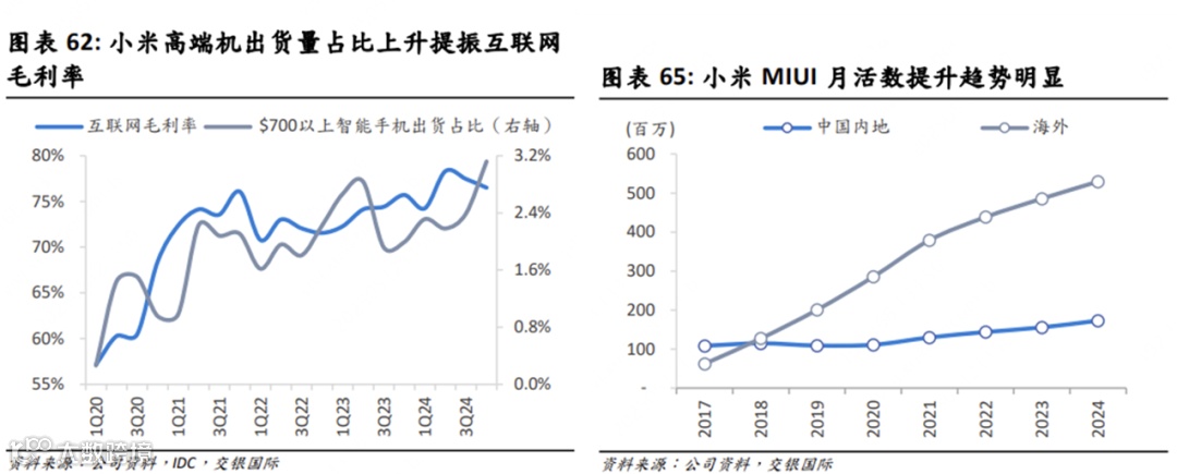 智能手机和AIoT在海外份额进一步扩张也将进一步提升小米互联网用户基数。历史上,小米通过在中国内地、印度等地区份额的不断渗透,其全球用户界面MIUI月活用户数从2017年底的1.7亿增长至2024年底的7.0亿以上。我们认为,随着小米智能手机与AIoT业务在其新零售战略下,在海外市场不断推进、市场份额的不断提升,其互联网用户基数有望进一步提升,尤其是在部分数字服务仍处于发展早期的新兴市场,小米更有望较早地抢占初步市场份额。此外,全新HyperOS是小米在早期MIUI生态上的进一步升级为其变现提供了更加有利的条件。