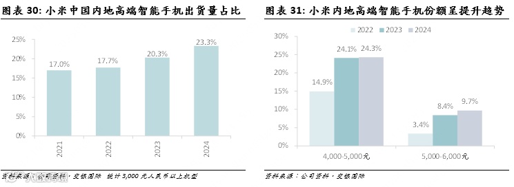 2024年小米智能手机高端化逆势扩张。通过整理IDC数据,全球高端智能手机(450美元以上)出货量占比从2023年的32.4%降至2024年的31.4%,尤其是1,000美元以上出货量占比下降更为明显,而小米高端机出货量占比在2024年同比增长0.8个百分点至8.8%,在全球高端机份额也同比增长0.7个百分点至3.8%。其中,小米在中国内地的高端化推进顺利,根据Canalys数据,小米手机2024年3,000元人民币以上机型出货量占比提升3.0个百分点至23.3%,5,000-6,000元人民币机型出货量占比提升1.3个百分点。