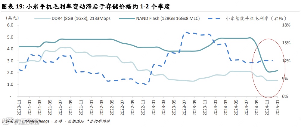 我们认为,存储器价格对于小米手机的毛利率影响最为直接。我们观察到NAND和DRAM价格在2H24开始下降。