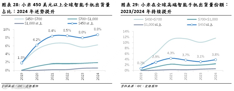 小米15系列展现其智能手机高端化实力。2024年,小米在高端化方面取得领先于行业的成绩,部分原因来自小米15系列的出色表现。2024年10月发布的小米15系列首发搭载高通骁龙8至尊版处理器,采用标准小屏设计的同时,依然采用1/1.3英寸大底传感器、超声波指纹传感器、IP68防尘防水等性能设计。小米15系列在起售价从上一代小米14系列的的3,999元提高至4,499元的基础上,相比上一代更快地突破百万台销量,且小米15 Pro的出货量增速高于标准版。更高阶版的小米15 Ultra也于2025年3月开启在中国内地首销,管理层表示其首销销量较上一代同比增长超50%,且在海外预售量相比上一代实现了超过100%的增长。4Q24小米在全球450-700美元高端机出货量份额也取得了16.2%的历史新高,环比增长7.9个百分点,展现了公司强劲增长的品牌力和在高端化的持续突破。