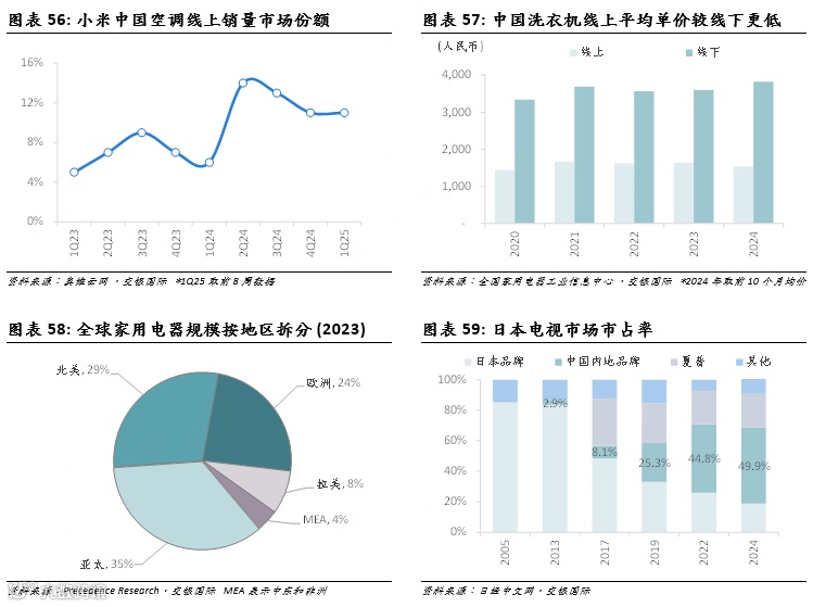 大家电出海启动,AIoT在海外迎来份额提升和高端化的机会。根据Precedence Research数据,2023年亚太地区占全球家用电器规模的35%,分摊到中国的占比则更低。根据管理层,目前小米AIoT海外收入占比仅为三分之一,但海外AIoT市场体量是中国的两倍,且2024年海外AIoT的收入增速较中国内地更快。小米从2025年开始启动大家电出海,为空冰洗产品进一步打开市场空间。AIOT出海方面,以日本市场为例,根据日经中文网数据,近3年日本电视市场中,中国内地品牌不断获取市占率。管理层表示,小米2024年在日本市场推出的高端大屏智能电视市场反应较好,我们认为这主要来自于在显示技术相似情况下中国内地电视厂商强大的产品力。我们认为,小米电视在日本成功出海的经验,一定程度验证了小米AIoT海外市场高端化的能力和机会,我们对其大家电出海表现较为乐观。