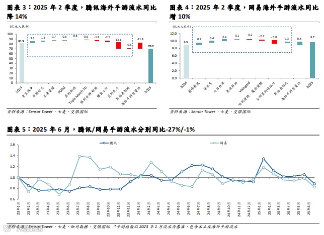 腾讯海外流水同比减12亿元/14%,主要因《荒野乱斗》高基数影响,但部分被《皇室战争》及新游《帝国时代》增量贡献所抵消。《荒野乱斗》维持3-4亿元流水量级,预计高基数影响持续。