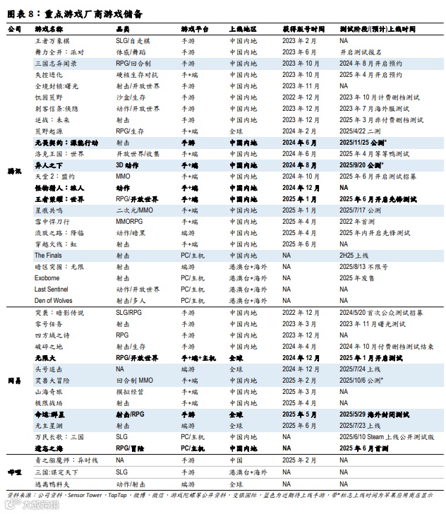 腾讯:同比净减28亿元/8%,主要因《MDnF》高基数,部分被新游《三角洲行动》及《王者荣耀》/《和平精英》增量所抵消。《王者荣耀》持续发力IP联动,《和平精英》地铁逃生玩法DAU超3700万,PC模拟器更新受用户好评,登WeGame热度榜第4。新游《胜利女神:新的希望》、《最终幻想14:水晶世界》流水低于预期,及《无畏契约:源能行动》、《异人之下》、《王者荣耀:世界》上线计划。