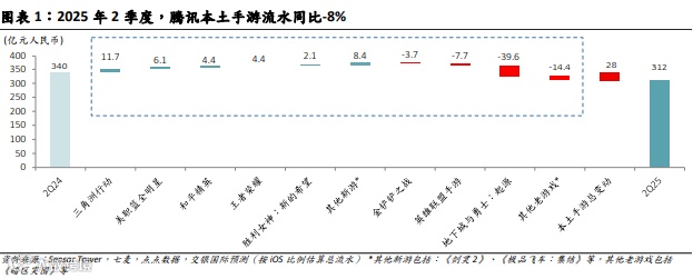 腾讯:本土流水同比净减28亿元(人民币,下同)/8%,主要因《MDnF》高基数,部分被新游《三角洲行动》及长青游戏增量所抵消。《和平精英》地铁逃生玩法DAU超3700万,PC模拟器版本登WeGame热度榜第4。海外流水同比减12亿元/14%,主要因《荒野乱斗》高基数影响,但部分被《皇室战争》及新游《帝国时代》增量贡献所抵消。《荒野乱斗》维持3-4亿元流水量级,预计高基数影响持续。