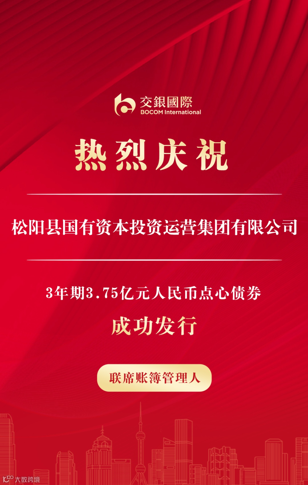11月5日,交银国际作为联席账簿管理人助力松阳县国有资本投资运营集团有限公司(“松阳国投”)成功定价3年期3.75亿元人民币点心债券,发行收益率为5.5%。在坚实的基石订单支持下,发行人于5日以最终价格指导5.5%向市场打开簿记,并顺利完成此次债券发行。发行过程中,交银国际依托强大的销售网络,成功落实市场订单,助力发行人在波动市场中成功发行。