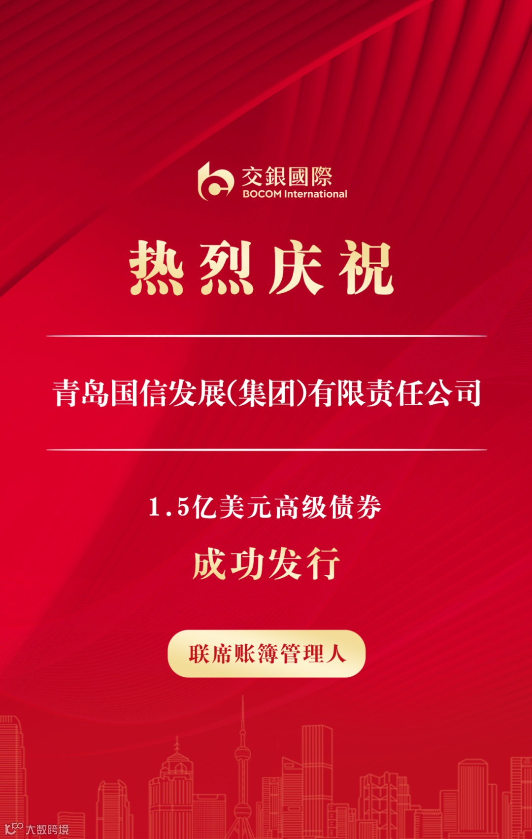 7月15日,交银国际作为联席账簿管理人协助青岛国信发展(集团)有限责任公司(青岛国信集团)成功定价发行3年期1.5亿美元高级债券,发行收益率为6.1%。在联合承销团的建议下,发行人于7月15日以初始价格指导6.5%区间向市场打开簿记。在坚实的基石订单支持下,最终发行价格6.1%,较初始价格大幅收窄40个基点,成功定价1.5亿美元。发行过程中,交银国际依托强大的销售网络,积极主动进行市场推广,协助公司落实基石订单,助力公司美元债项目圆满成功。