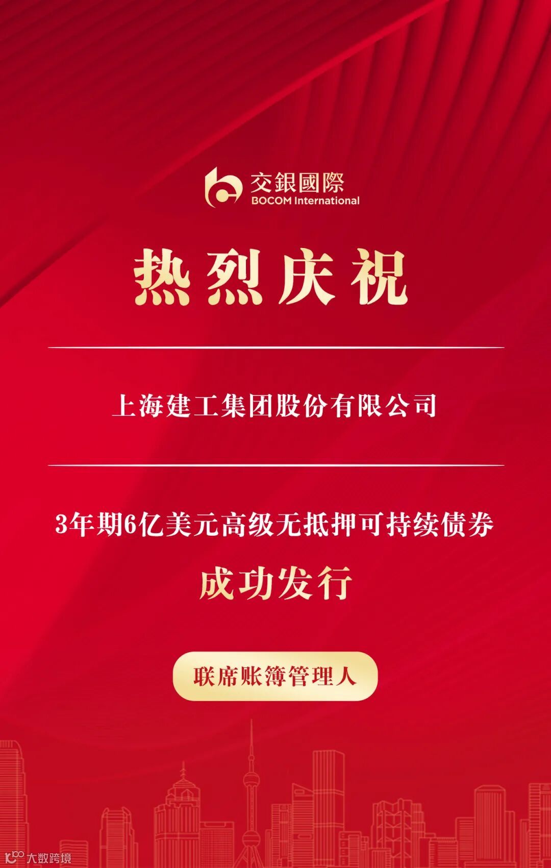 5月27日,交银国际作为联席账簿管理人助力上海建工集团股份有限公司(“上海建工”)成功担保发行3年期6亿美元高级无抵押可持续债券。在联合承销团的建议下,发行人以初始指导价5.2%区间向市场打开簿记,最终发行价格4.6%,较初始价格大幅收窄60个基点。该笔债券受到全球投资者高度关注,市场需求旺盛,发行当日中午订单金额已超过21亿美元,下午峰值更超过30亿美元,超额认购逾5倍。