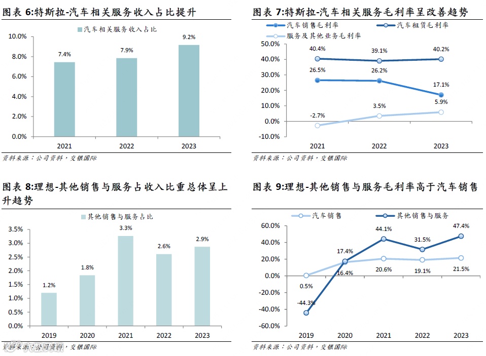 由于新能源车市场竞争激烈,车企日益重视售后服务市场。从新能源车企的收入结构来看,汽车出售之后的服务包括零部件销售、维修等收入占比呈提升趋势。服务收入增速快于汽车销售收入,同时毛利率呈提升趋势。如特斯拉汽车相关服务收入占比呈提升趋势,2023年占比9.2%;汽车相关服务毛利率呈改善趋势;从理想汽车来看,汽车销售以外的销售和服务包括安装和销售充电桩,线上商店的产品销售,会员服务,碳积分收入等,占收入比重总体呈上升趋势,毛利率显著高于汽车销售。