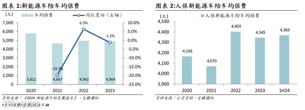 从车均保费来看,我们预计新能源车险车均保费总体保持稳定,随着新能源车占比提升,拉动整体车均保费呈小幅上升趋势。