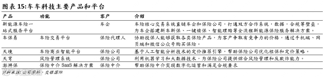 车车科技是一家保险科技公司,成立于2014年,2023年9月通过SPAC方式在纳斯达克交易所上市。目前旗下拥有车保易、新能源汽车保险平台、澎湃保、天境和天穹等产品和系统,布局形成四大保险子生态:新能源汽车保险SaaS系统及运营服务、代理人展业平台、保险中介行业SaaS系统、AI智能定价及反欺诈辅助系统大模型。