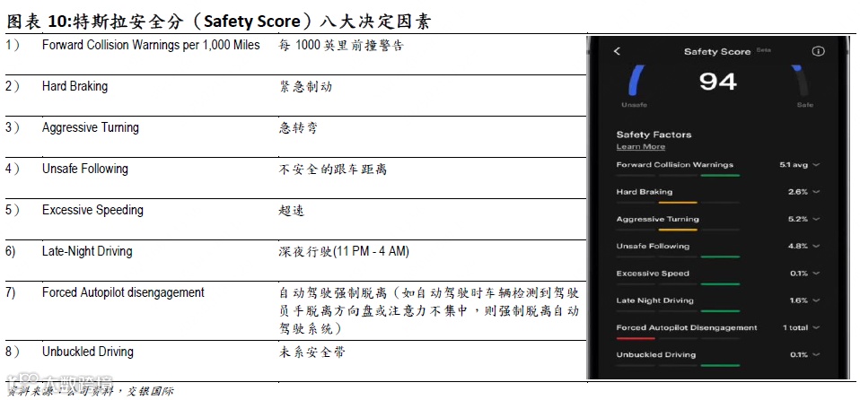 特斯拉使用 Safety Score Beta 来衡量车主的驾驶安全性。车险保费基于过去 30 天内每日安全评分的里程加权平均值,安全评分越高,保费就越低。从特斯拉车险的安全分模型来看,通过对八大影响因素赋予不同权重,相乘得到PCF(Predicted Collision Frequency,预测碰撞频率),再然后通过公式将PCF转化成安全分(0-100之间)。特斯拉计算过去30天的每日安全分,转化为行驶里程数加权的加总安全分。每次驾车出行,安全分将会在当日进行更新。特斯拉保险以月度为频率来计算保费。安全分越高,保费越低,从而使客户有动力采取更安全的驾驶行为。