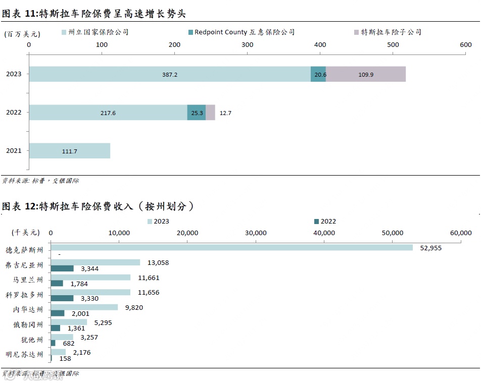从2022年开始,特斯拉开始提供自营车险。2022年1月,特斯拉通过收购Balboa Insurance Co.及其两间关联公司,加速向特斯拉消费者提供保险业务。这些公司随后被更名为特斯拉保险有限公司(Tesla Insurance Co.)、特斯拉财险保险有限公司(Tesla Property & Casualty Inc.)和特斯拉通用保险公司(Tesla General Insurance Inc.)。从保费收入来看,特斯拉通过MGA(管理总代理)销售的车险保费2023年为4.1亿美元,通过特斯拉车险子公司销售车险1.1亿美元,合计达到5.2亿美元,同比增长78%。特斯拉车险子公司的保费收入2023年较2022年显著增长,其中德州占比最高,占到特斯拉自营车险保费的一半。