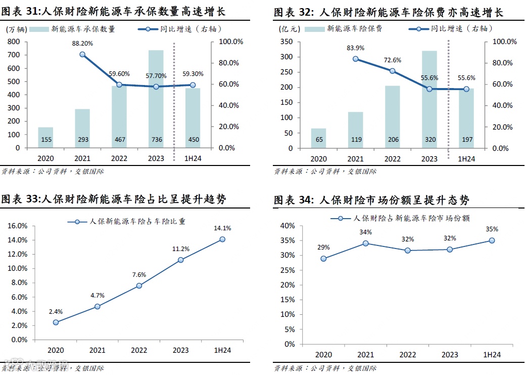 根据中国人保2024年开放日数据,2024年人保财险在新能源家自车上已经实现承保盈利。公司在发展新能源车险上具有领先行业的定价优势,通过海量数据积累和模型迭代,形成精细精准定价能力,同时也具备渠道优势和理赔优势。