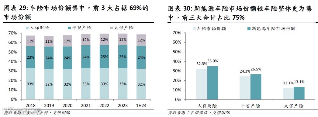 內地车险市场份额高度集中。从车险市场竞争格局来看,2024上半年,人保、平安和太保车险市场份额分别为33%、24%和12%,三家龙头合计市场份额为69%,竞争优势突出,市场份额稳固,竞争格局均保持稳定。