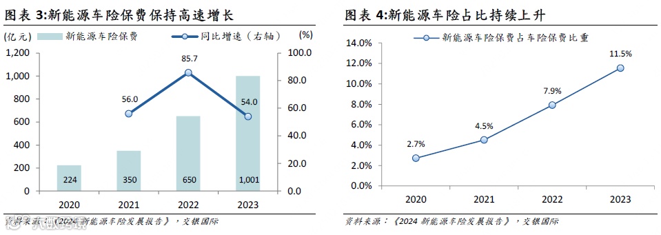 新能源车险快速增长,占车险比重呈上升趋势。随着新能源车渗透率提升,以及新能源车均保费高于传统燃油车,新能源车险保费保持快速增长,2020-23年CAGR达到65%。2023年新能源车险保费达到1000亿元,占整体车险保费的比重达到11.5%,较2022年上升3.6个百分点。