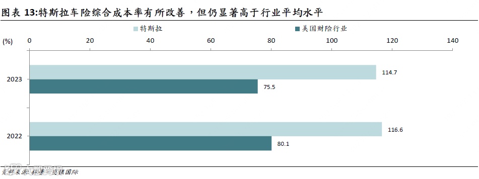 根据COVERAGER的数据显示,2023年特斯拉自营车险业务产生净亏损3000万美元左右,其中特斯拉通用保险公司的综合成本率为145%,特斯拉财险公司综合成本率为139.4%。综合成本率较高主要由于赔付率高。根据标普数据,2023年特斯拉自营车险业务赔付率为114.7%,同比改善约2个百分点,但仍显著高于行业平均水平。