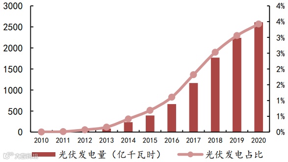 图表:2010-2020中国光伏发电量和渗透率情况