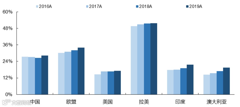 图表:主要国家和地区可再生能源发电量占比