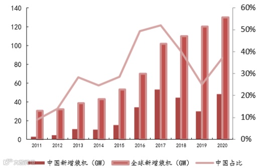 图表:2011-2020中国及全球光伏新增装机情况