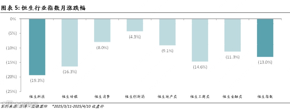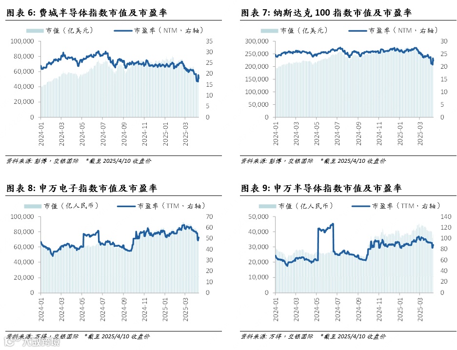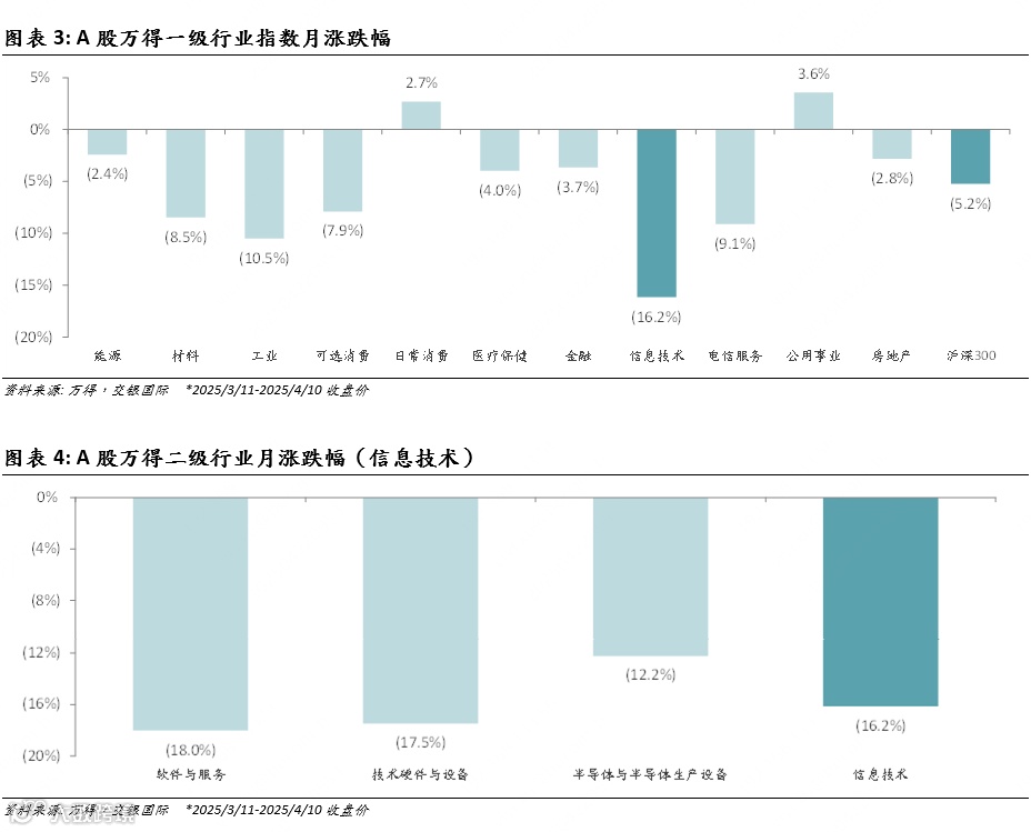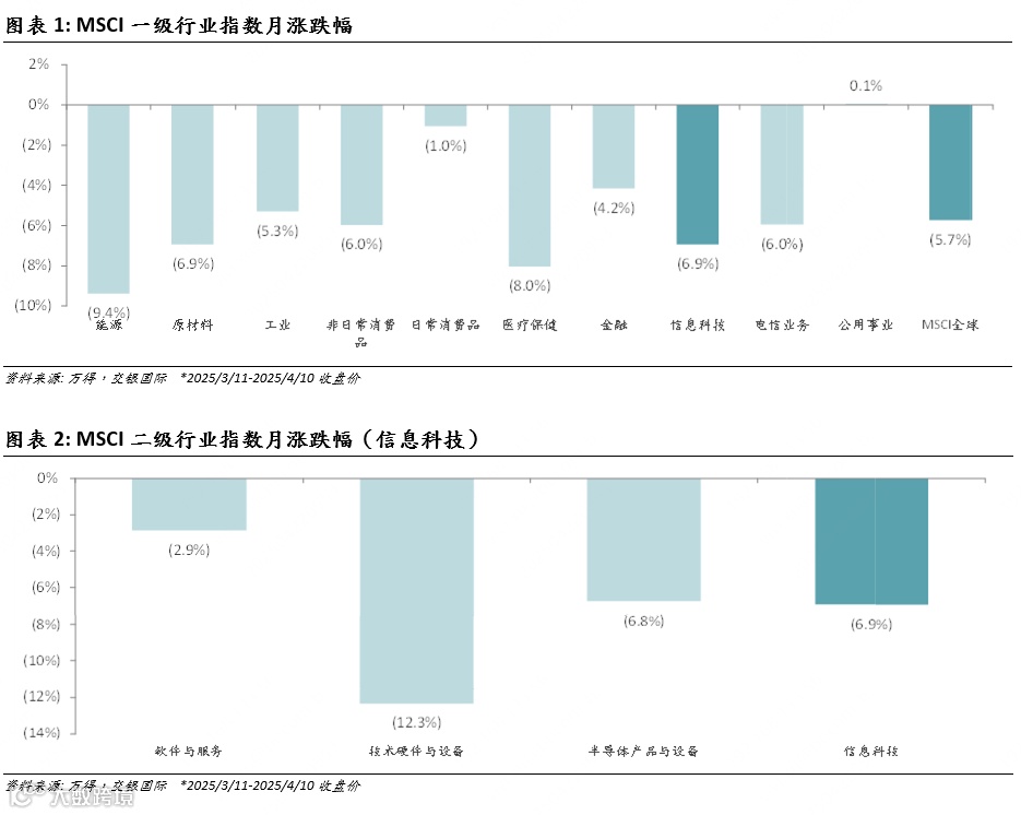 2025年3月11日至4月10日,全球科技行业股票普遍承压。MSCI信息技术指数跌6.9%,跑输MSCI全球指数(跌5.7%);技术硬件与设备跌幅最大,达12.3%。A股方面,Wind信息技术指数跌16.2%,领跌沪深300(跌5.2%);软件与服务、技术硬件与设备跌幅均较大。港股方面,恒生科技指数跌19.3%,领跌恒生指数(跌13.0%)。从估值角度看,费城半导体指数/纳斯达克100指数市盈率近一个月分别下跌2.8倍/1.4倍,处于2024年初以来低位。申万电子/申万半导体指数市盈率近一个月分别下跌9.6倍/12.2倍,较2025年2月的高点有较大回调,我们认为其中部分来自年初以来中国科技公司重估之后的情绪调整。