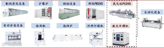 PERC技术目前是市场主流,一方面,PERC技术可带来电池效率提升且技术较为稳定;另一方面,PERC技术的应用,仅是在传统的铝背场(BSF)生产线上新增氧化铝PECVD和激光开槽机设备,生产线升级改造较为简单且成本较低。其中,氧化铝PECVD设备主要用于在PERC电池沉积背面氧化铝,而传统PECVD设备用于在电池表面沉积氮化硅;激光开槽设备用于对背面钝化膜进行精密刻蚀,在PERC电池背面开孔,实现背面电机与硅衬底的接触。
