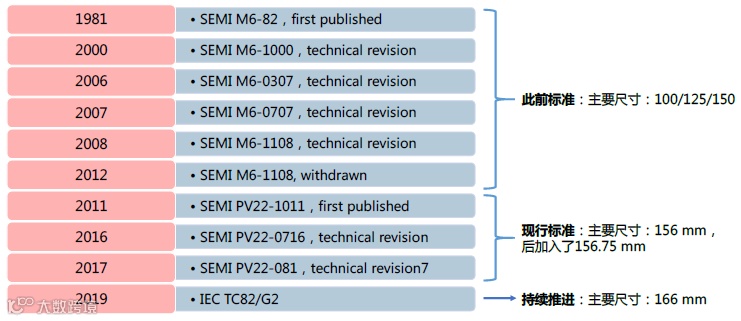 从硅片尺寸来看,根据国际半导体产业协会SEMI制定的硅片尺寸标准划分,光伏硅片尺寸经历了3次主要的变革: