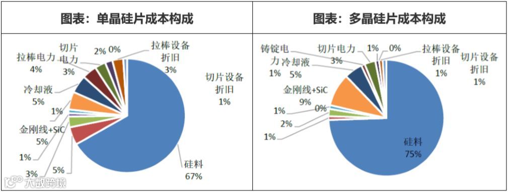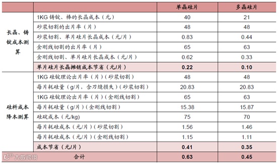 硅片成本是太阳能电池片的主要成本,约占总成本的65%。硅片成本中除了硅料外,主要成本便是铸锭或拉棒成本和切片成本。在连续直拉单晶技术(CCZ)和金刚石切割线技术应用下,单晶的成本降幅远高于多晶,具体测算如下: