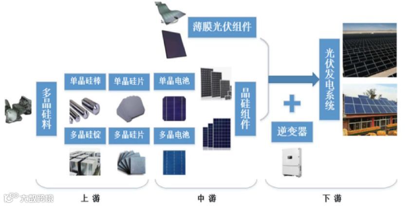 光伏产业链可以分为硅料、硅片、电池片、组件、系统五个环节。从硅片生产到电池组件再到系统应用,构成光伏产业链上中下游。硅料(硅锭/硅棒)、硅片等基础产品的生产制造属于光伏产业上游,太阳能电池片和组件等关键产品属于产业链中游部分,太阳能发电系统和应用属于下游环节。