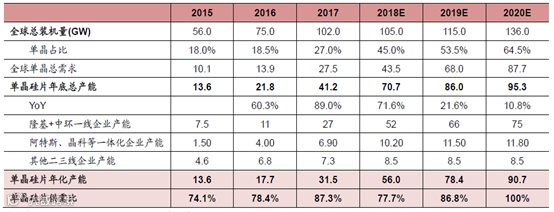 根据浙商证券预测,2019-2020年全球光伏总装机量分别115GW、126GW,单晶占比53.5%、64.5%,单晶需求分别是68GW、79.3GW。PVInfolink统计数据显示,2019年单晶硅片总产能达86GW,年化有效产能78.4GW,单晶硅片供需比接近90%。