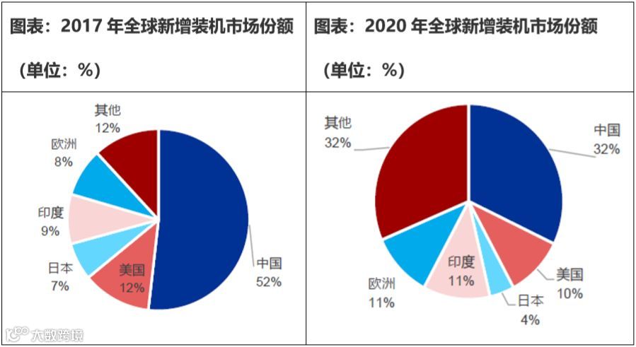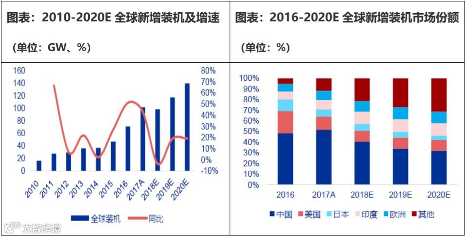全球光伏装机持续增长,中美日印是全球光伏装机增长主力。近年来,全球光伏产业蓬勃发展,光伏新增装机持续增长,从2014年的37.04GW增长至2017年的102GW,复合增长率为40.2%。中国、美国、日本、印度、欧洲是全球光伏的主要市场,2017年合计占比约88.2%。中国是全球第一市场,市场占比约51.8%,其次为美国、印度、欧洲、日本,占比分别为12.3%、8.8%、8.6%、6.7%。
