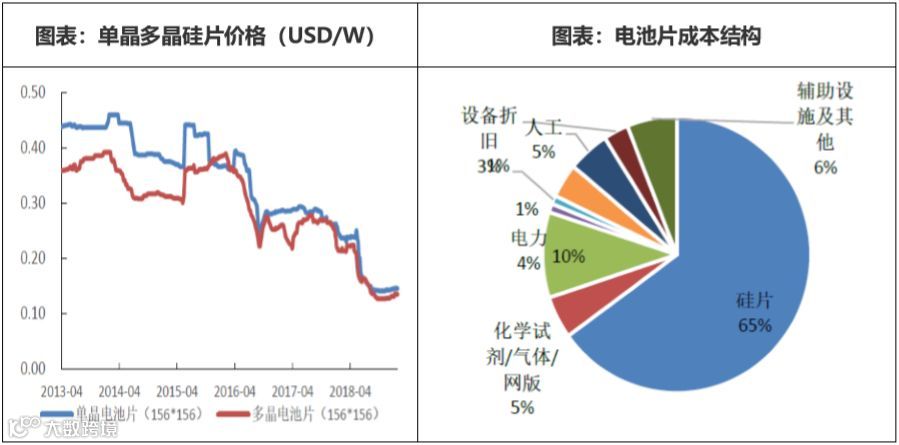 电池片成本不断下降中。电池片成本中,硅片成本约占65%,非硅成本中正面、背面银浆料成本约占11%、设备折旧成本约占3%。电池片生产企业第一梯队如隆基非硅成本在0.3元/W左右,通威据称已经降至0.25元/W,仍在不断下降中。