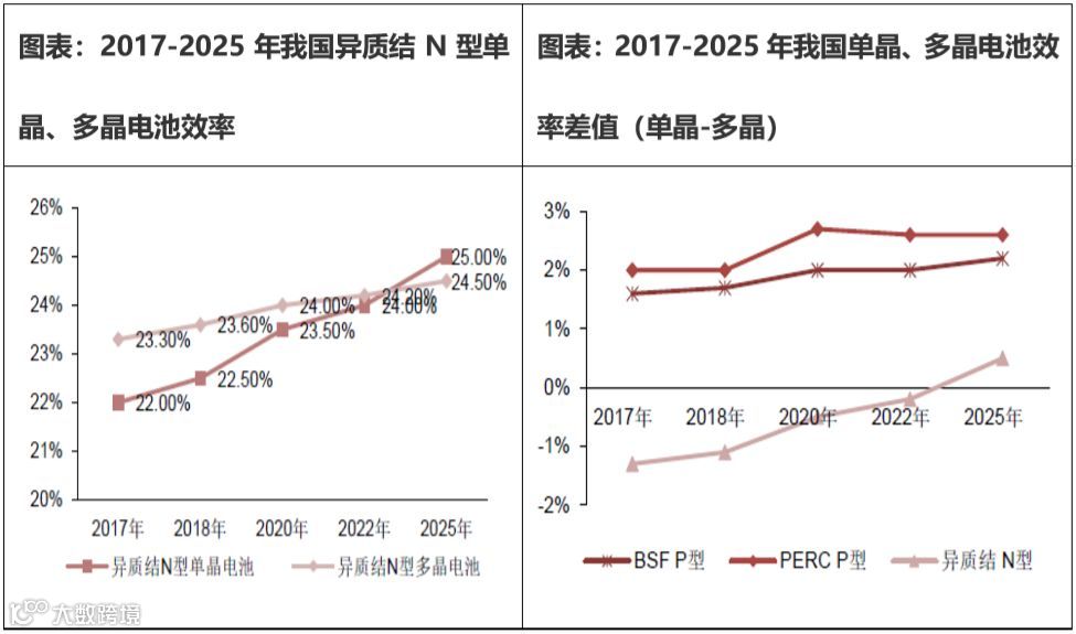 PERC、N 型电池、HJT 等新技术不断应用,单晶提升空间更广。提效降本实现平价上网驱使PERC、N 型电池、HJT 等新技术不断投入应用,目前,PERC 技术是主流、N 型晶硅电池、HJT异质结电池和IBC 背接触电池将是未来主要发展方向。具体来看,新技术为单晶电池带来的效率提升幅度显著高于多晶,单多晶效率间差距逐年增大。以PERC 技术为例,预计至2020 年单晶硅电池片平均转化效率可达22.4%,较2017 年总体增加1.1%,而同技术下多晶增幅仅0.8%。而异质结技术虽初期阶段单晶转化效率略低于多晶,预计在2022 年追平。综上,单晶在新技术应用后效率提升更为明显,未来单晶效率提升机会更值得关注,单晶的发展空间更广。