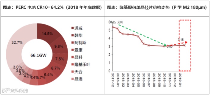 电池片:电池片环节的技术资金壁垒相对低,同时技术路线很多,厂商比较分散,统计数据显示2017年电池片CR11=67%,单晶硅片领域仅隆基和中环产能占比就达74%,单晶硅片龙头企业掌握定价权,议价能力强。最新数据显示,2019年1月29号中环单晶硅片价格由3.1元/片提升至3.25元/片,2月22日隆基调整单晶硅片价格,由3.05元/片提升至3.15元/片。