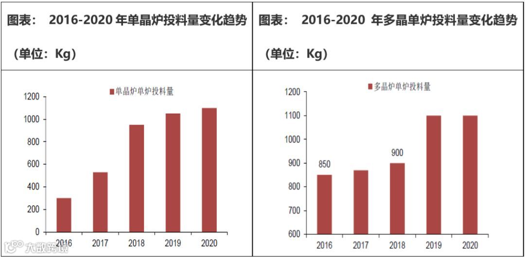 单晶拉棒与多晶铸锭的成本主要由设备折旧费、人工费、水电费、辅料费、原料损耗等构成,单炉产出差异是单晶拉棒与多晶铸锭成本差异的主要原因之一。得益于连续直拉单晶技术(CCZ)的应用,单晶投料量大幅提升,中国光伏行业协会最新统计数据显示,2018 年单晶炉单炉投料量为950kg,较2017 年的530kg 提升80%,较早期200-300kg 投料量提升3-4 倍,未来随着热场的增大以及连续拉棒技术的提升等催化因素,投料量将逐年增大,预计到2020年可达到1100kg;另外得益于机器的改进,单炉出棒数也由1 根增加至3-5 根。设备的改进降低单晶长晶成本,为单晶的发展带来机会。