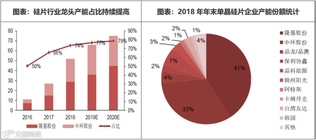 硅片:单晶电池片上游为硅片的制造,硅片行业属于重资产,具有明显的规模效应,龙头企业因产能大、供给稳定,相比二三线厂商具有一定的竞争优势。近两年,单晶硅片市场以隆基、中环两大龙头企业的扩产为主,2018年产能合计达52GW,其产能市占率以由2016年的50%左右迅速提升至2018年的74%,根据目前公开资料来看,明后年主要扩产企业仍然为中环和隆基,其市占率将进一步提升。