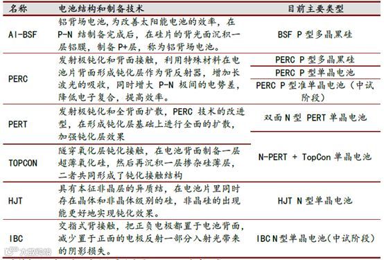 工艺端,主要是电池片技术的升级,目前主流技术是PERC,N 型晶硅电池、HJT 异质结电池和IBC 背接触电池等是未来重点发展方向。