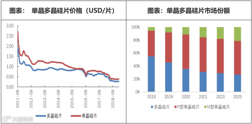 从太阳能电池片单晶、多晶路线角度,近年基于连续投料、金刚石切割线等技术的发展,单多晶硅片成本缩小,单晶硅片市场替代趋势愈加显著,统计数据显示,单晶硅片国内市场份额从2017年的31%提升至2018年的45%,全球市场份额在过去一年内从28%增至46%。根据浙商证券预测,预计未来单晶硅仍将保持良好增长势头,2019年预期国内市场份额将达64.5%,全球达57%,单晶市占率将首超多晶。