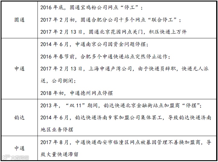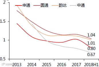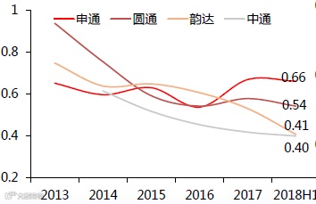 通达系的各公司,虽然均采用加盟制,但是各家的加盟商体系(利益切分、结算等),业务环节的自营程度等均存在差异。其中,中通、韵达主要采用转运中心自营化,两端加盟模式,并通过软件系统,将加盟商纳入管理,同时通过自身降本,向加盟商切分更多的利益,从而稳定加盟商体系。从结果来看,中通、韵达目前在加盟商关系处理上存在一定优势。不过,利益问题,是个天平问题,总会存在一定的纠纷导致失衡,只能通过各公司的管理层风格、水平等维度来对加盟商体系稳定性进行侧面评估。