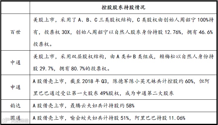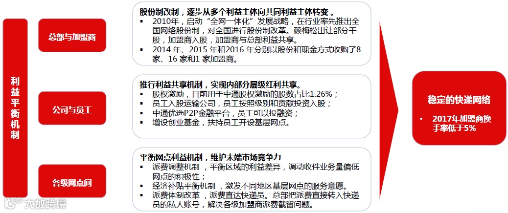 小编认为,影响通达系长期竞争力的因素可以概括为“利益平衡”。利益平衡主要看三个维度:1)股权结构;2)股权激励;3)网络稳定性。其中,股权结构和股权激励,是“放之四海而皆准”的共性指标;网络稳定性,针对通达系主要是指“加盟模式”,属于特性指标。