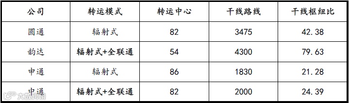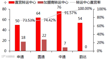 1)转运中心的数量决定快递公司网络布局的运输能力。过多的转运中心会提升运营成本,过少的转运中心会降低快递运送效率。目前来看,50-80个转运中心是合理的数量空间。转运中心的直营化水平决定快递公司的管理能力。转运中心直营率越高,表明总部对转运中心和全网的管控力越强,更高的转运中心直营比例有利于提高全网的效率和稳定性。