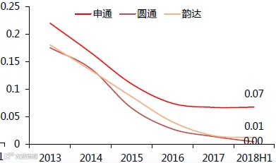 从股权激励来看,通达系的股权激励水平均较低,除中通的股权激励占总股本的1.26%,其他各家公司的股权激励占总股本的比例均在0.2%以下。相对来说,中通的股权激励更符合“共建共享”理念,有助于企业良性发展。