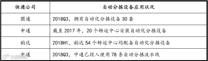 2)自动化设备是转运中心的配套设备,也是降低人工成本,提高已分拣效率的关键。快递运输对时效性有较高的要求,在装卸、分拣、装车等环节均需投入人力和设备,生产设备智能化对快递企业正常运转和成本控制至关重要。目前针对转运中心的自动化设备多种多样,各行业龙头也针对自身经营情况对新设备进行研发。但自动化设备的关键在于普及水平,仅少数转运中心进行自动化改造对于总部来讲效果甚微。