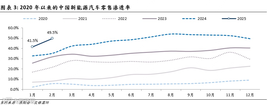 2月新能源汽车零售维持同比增势,渗透率升至49.5%。