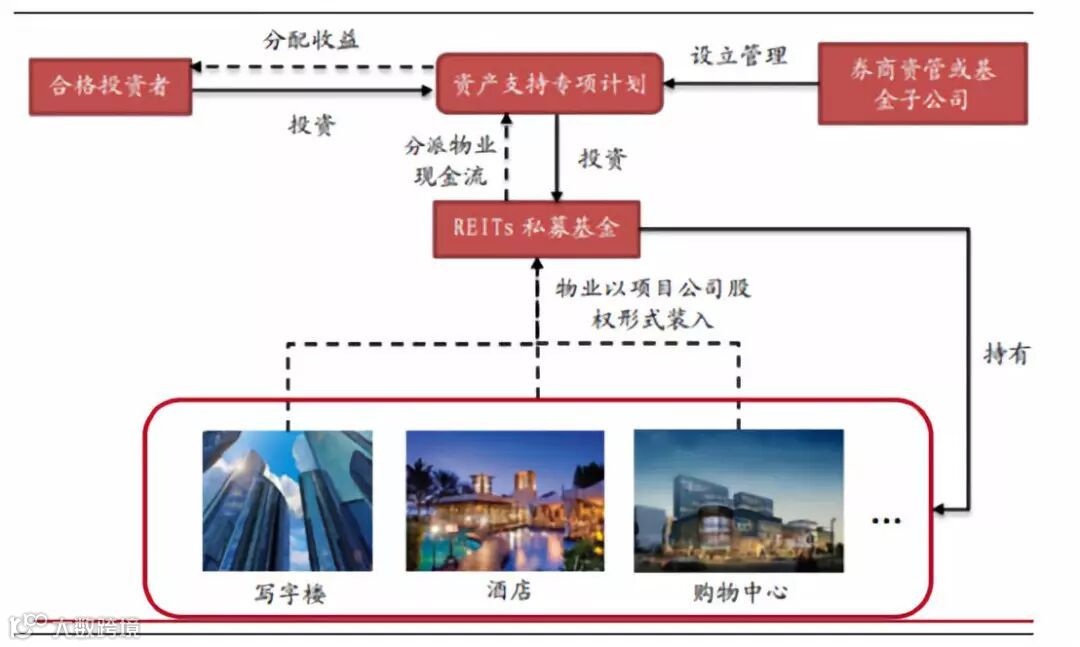 由于国内尚缺乏与REITs 相配套的法律法规及监管政策,目前国内REITs只能通过券商或基金子公司的“资产支持专项计划”等方式嫁接私募合格投资者,是一种“类REITs” 模式。