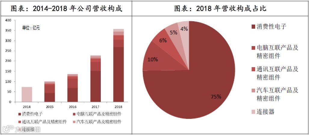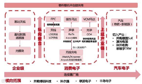 通过内生+外延并购战略,公司产品覆盖消费电子、企业级与汽车及医疗三大领域。在消费电子产品中,公司生产包括连接线、连接器、天线、音频转接头,无线耳机、无线充电模组、声学、线性马达等;在企业级产品中,公司生产包括连接线及连接器、基站天线、滤波器等产品;在汽车及医疗产品中,公司供应汽车线束、连接器和连接线和新能源车部件等。