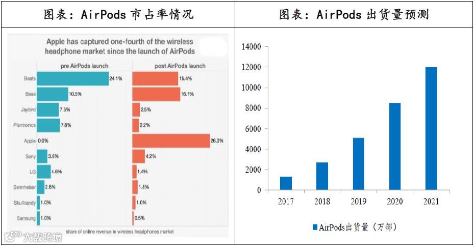 AirPods是苹果有史以来最为畅销的配件。根据Slice的数据,AirPods拿下了耳机市场26%的市场份额,2017年出货量达1300万,2018年出货量达到2600-2800万部,预计2019年为5100万部,2020年达到8500万部,2021年达到1亿部以上。
