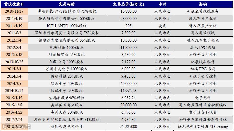 公司从线束代工和组装起步,逐步发展成为国内连接器行业的龙头企业。2010年公司登陆A股市场,借助资本市场通过不断的外延并购拓展能力边界。2010年通过收购江西博硕,完善了线束加工能力;2011年收购昆山联滔,成为苹果内部线束主力供应商,切入了苹果产业链;收购科尔通和台湾宣德,进入通信行业,与华为、艾默生等通信巨头建立紧密合作关系;2012年收购珠海双赢,切入FPC领域;2014年收购苏州丰岛,进入可穿戴领域;2016年收购苏州美特,成为苹果声学供应商,17年继续收购惠州美律,切入国内声学模组供应链。