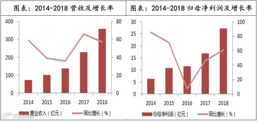 公司营业收入从2014年的72.96亿元增长到2018年的358.5亿元,CAGR达到48.9%,归母净利润从2014年的6.3亿元增长到2018年的27.23亿元,CAGR达到44.2%。进一步,根据公司今年三季报,2019年前三季度营收378.4亿元,归母净利润28.9亿元,同比增长74.3%。