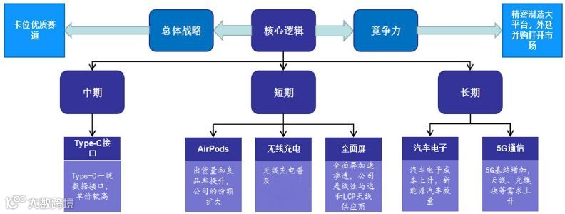 公司通过主要产品布局,构筑平台型企业,力图保持公司“短、中、长期”增长。短期来看,公司作为苹果的供应商之一,受益于AirPods等新产品的推出以及线性马达、LCP天线等产品的渗透率不断提升。目前AirPods的组装厂商有立讯、英业达及歌尔股份等公司,公司在精密制造和生产良率方面表现突出,随着AirPods出货量提升,预计公司的份额会不断提升。同时,LCP天线在5G具有较大的优势,公司目前是苹果LCP天线模组的主要供应商;大客户力推无线充电,在无线充电方面,公司在模组与线圈领域具有双重优势,成为iwatch无线充电模块和手机无线充电接收端的主要代工厂商,受益于无线充电市场爆发。另一方面,公司成为线性马达的主要供应商,随着全面屏渗透率上升,公司的马达业务潜力巨大。